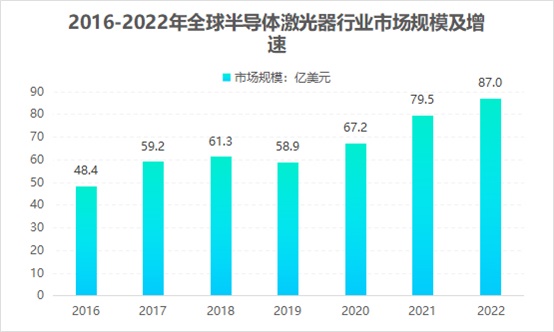 在半導體激光加工應用以及中高功率光纖激光器差異需求的推動下,具有中高率、高光束質(zhì)量的半導體激光器快速發(fā)展,半導體激光器也成為光電行業(yè)中最有發(fā)展前景的領(lǐng)域之一。數(shù)據(jù)顯示,全球半導體激光器市場規(guī)模穩(wěn)步提升,2021年全球半導體激光器市場規(guī)模達到79.46億美元,同比增長18.17%。2022年市場規(guī)模約為87.0億美元。
